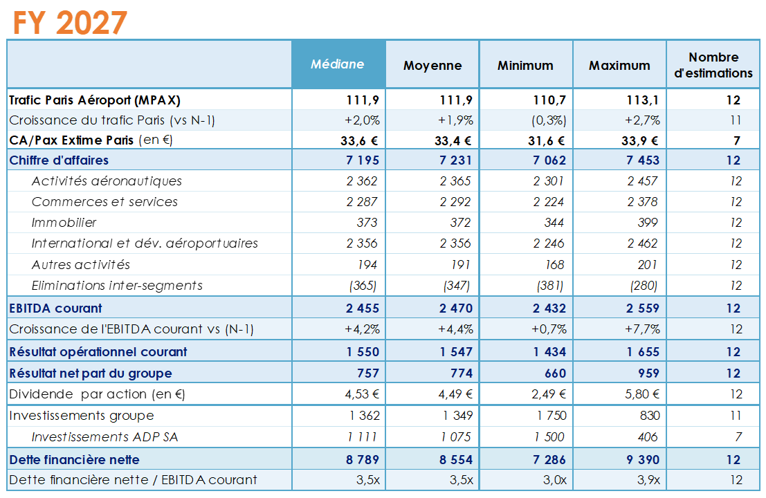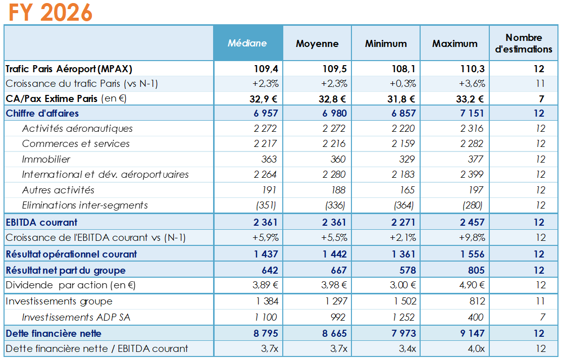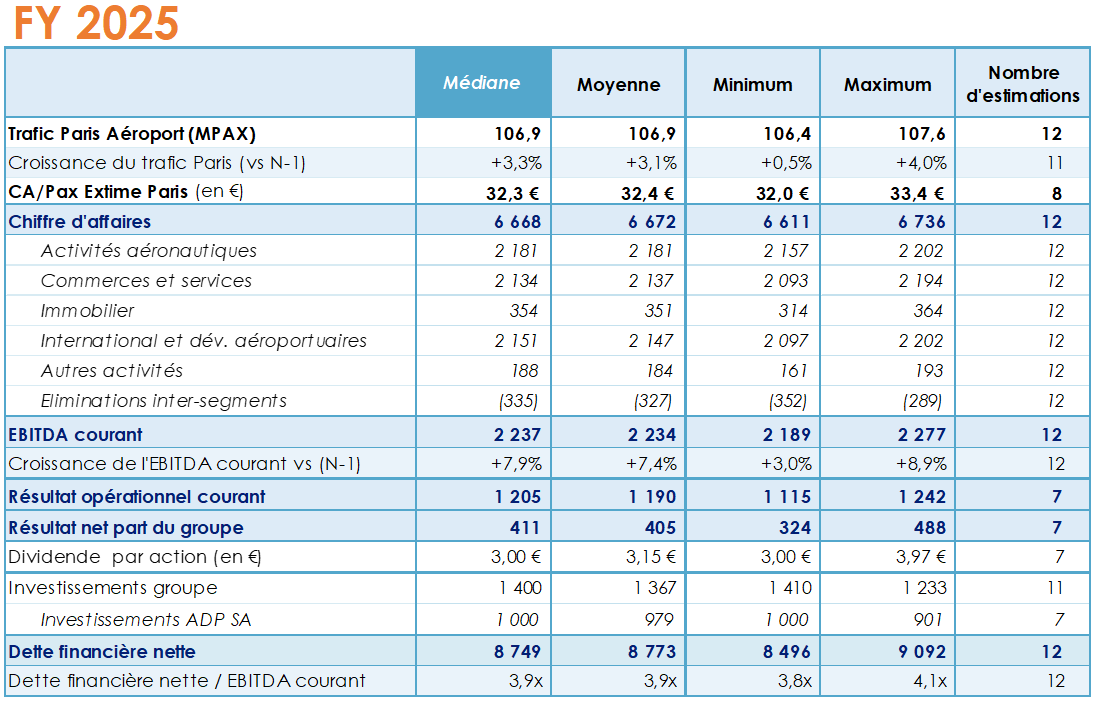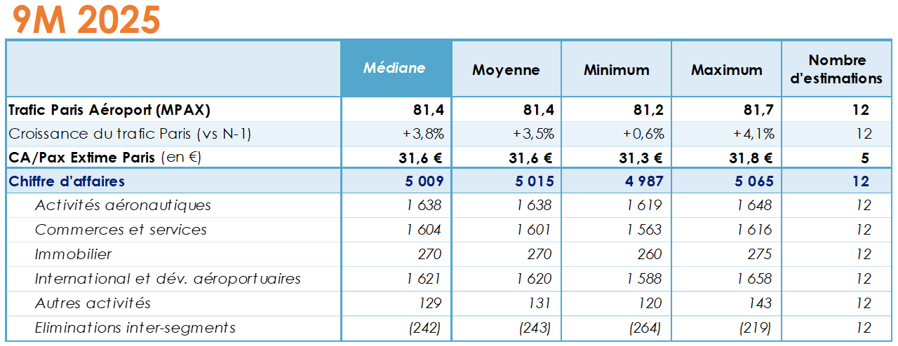 Le consensus ci-dessous est composé des estimations des analystes financiers sell-side suivant activement le titre Aéroport de Paris et collectées par le Groupe, entre le 6 et le 17 octobre 2025, en amont de la publication du chiffre d'affaires des 9-mois.